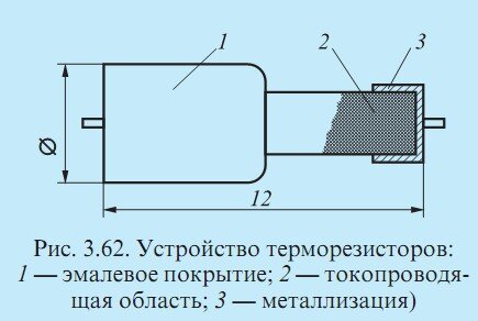 Большую часть ТР с отрицательным ТКС изготовляют из поликристаллических оксидных полупроводников. Обычно используют смеси оксидов никеля и марганца; никеля, марганца и кобальта; меди, кобальта и марганца и др. Методами керамической технологии путем высокотемпературного обжига заготовок из оксидных полупроводников изготовляют ТР в форме стержней, трубок, дисков. На рис. 3.62 показано устройство терморезистора. При этой технологии велик разброс параметров однотипных образцов ТР.