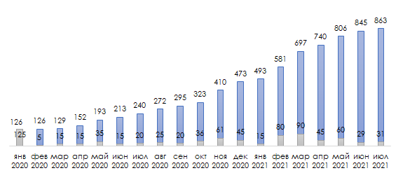 Динамика стоимости активов На конец июля стоимость активов в портфеле составила 863 тыс. рублей. Сумма пополнений портфеля с начала года составила 350 тыс. рублей. Динамика доходности Доходность инвестиционного портфеля в рублях за период с января 2020 года по июль 2021 года составила 24,89%, снизившись на 1,94%. Среднегодовая доходность портфеля за год и семь месяцев в рублях составляет 15,07%. Структура портфеля В июле как и писал ранее была уменьшена доля облигаций российских компаний, увеличена доля акций российских эмитентов. Рокировка сделана по причине увеличения ЦБ ключевой ставки и возможными трудностями рефинансирования займов компаний с низкими кредитными рейтингами. В августе планирую увеличить долю облигаций в иностранной валюте. Large-Cap U.S. Stocks В июле докупал акции Intel и Total. Компании восстанавливаются после 2020 года. На данный момент все компании из портфеля акций США крупной капитализации позитивно отчитываются за первые шесть месяцев 2021 года. Russian sto