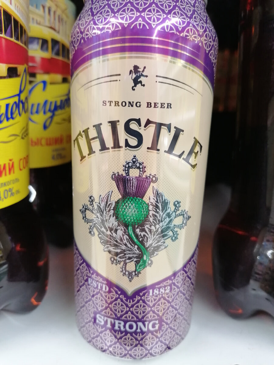 Представляю вашему вниманию пиво крепкое светлое фильтрованное пастеризованное THISTLE STRONG. Объем банки аж 0,5 литра и крепостью 7,7% оборотов. Состав: вода, ячменный солод, сироп глюкозы, экстракт хмеля. Искал себе что нибудь на вечер, не подумайте , что это детский обьем , просто хочу выпить, поесть и спать ведь завтра на работу. Исключительно искал крепкое пиво. И вот наткнулся на это чудо ну думаю надо брать и пробовать. Производят это пиво именно в Нидерландах, а это уже интересно. И так приступим к дегустации. Пиво светлое как слеза младенца, пивная шапка благородная. На вкус оно не какое. А точнее первое что чувствуешь так это какой-то мыльный раствор, будто мыло развели в воде и дали выпить. Чувство это длиться 2 секунды и это радует. Потом чувствуешь спирт, которого слишком много для 7,7%. С третьим глотком чувство спирта уходит и оно пьется как обычное легкое пиво. Но вот запах конечно не удовлетворяет меня , он пахнет мылом. Это как в юношеские времена была полторашка "Ар