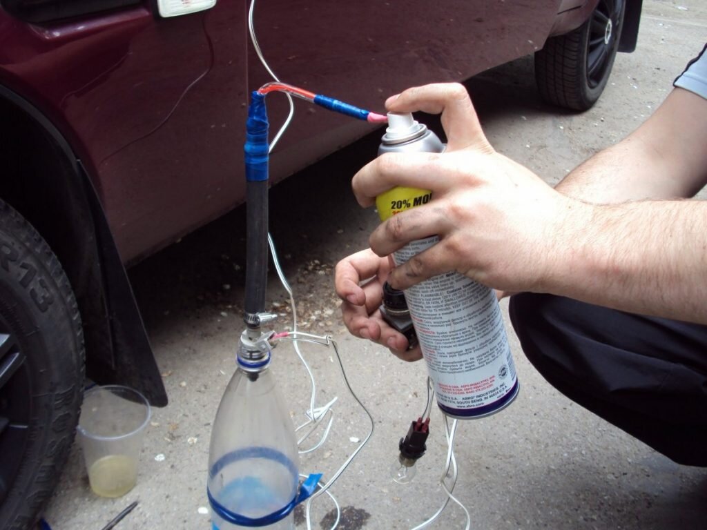 10. Убедившись, что схема работает верно, приступаем к очистке инжектора. Для этого сперва создаем давление в шланге, нажав на кнопку баллончика и выпустив некоторую часть жидкости в шланг, форсунка закрыта.