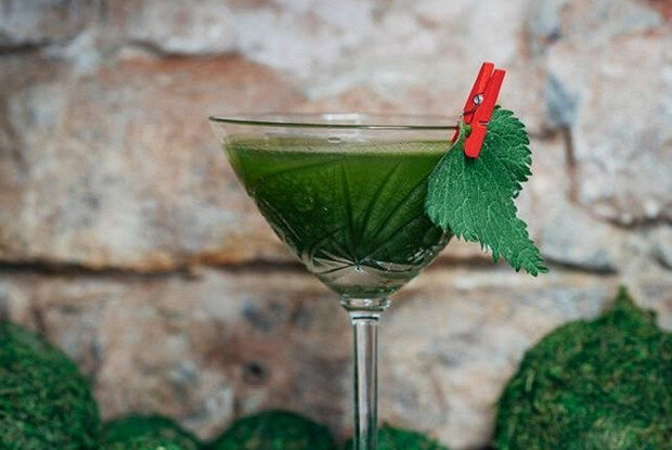 2. Затем надо выйти на улицу и нарвать немного крапивы. Отделить листья, ошпарить, заложить в блендер. Туда же сироп и лимонный сок. Пробить все блендером, а потом процедить, чтобы убрать жмых.