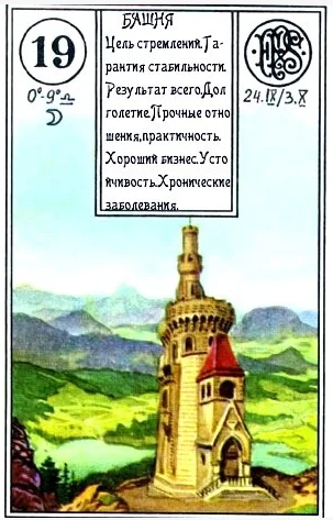 "Башня-это знак счастья для вас, растущего до тех пор, пока в облаках нет бури" Краткая интерпретация: стабильность, устойчивое положение, госучреждение, личные достижения, изоляция, стабильное время, долгие годы. Башня говорит о каком-то деле, на которое потрачено много сил и времени, возможно, дело всей жизни, важное для вас. Вы стоите крепко на ногах, вас ничто не сможет сломить. Если башня выпала с негативными картами, то она сулит испытания и трудности, так же проблемы с деньгами. Сочетание Башни Ленорман с другими картами: КРЕСТ – нелегкий период, проблемы на работе, тяжелое время. ЯКОРЬ – карьерный рост. РЫБЫ – прибыль, рост доходов. КЛЮЧ – Решение проблем, карьерный рост, удачное время для получения прибыли. ЛУНА – уважение, плохое самочувствие, больница. СОЛНЦЕ – религия, признание в обществе. ЛИЛИИ – высокая должность, повышение. ЖЕНЩИНА – влиятельная и неприступная женщина. МУЖЧИНА – влиятельный мужчина, внимания которого может сложно добиться. ПИСЬМО – официальные бумаги