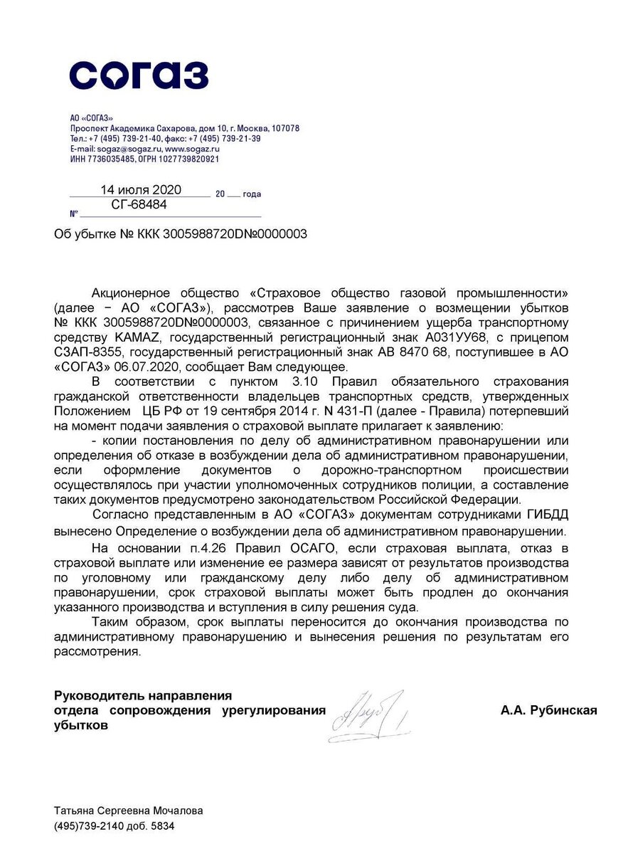 АО «СОГАЗ» не выполнило своих обязанностей по осаго. Очень жаль, что Банк России защищает незаконные действия АО «СОГАЗ». 14.08.2020 в АО «СОГАЗ» была подана претензия с требованием предоставить копию акта о страховом случае. АО «СОГАЗ» акт о страховом случае не был направлен, а вместо него направлен обычный ответ от 17.08.2020 с приложением копии акта осмотра транспортного средства на 5л., который вообще не просили. Исходя из этого, можно было предположить, что сотрудники АО «СОГАЗ» не поняли смысл претензии от 14.08.2020, поэтому была подана претензия повторно с требованием предоставить именно акт о страховом случае. 14.10.2020 АО «СОГАЗ» осуществило выплату страхового возмещения, но акт о страховом случае так и не был предоставлен. Единственным выходом из этой ситуации является подача в Банк России заявления о привлечении АО «СОГАЗ» к административной ответственности по по ч. 3 ст. 14.1 КоАП РФ. Смысл заключается в том, что при рассмотрении данного заявления Банк России не сможет на