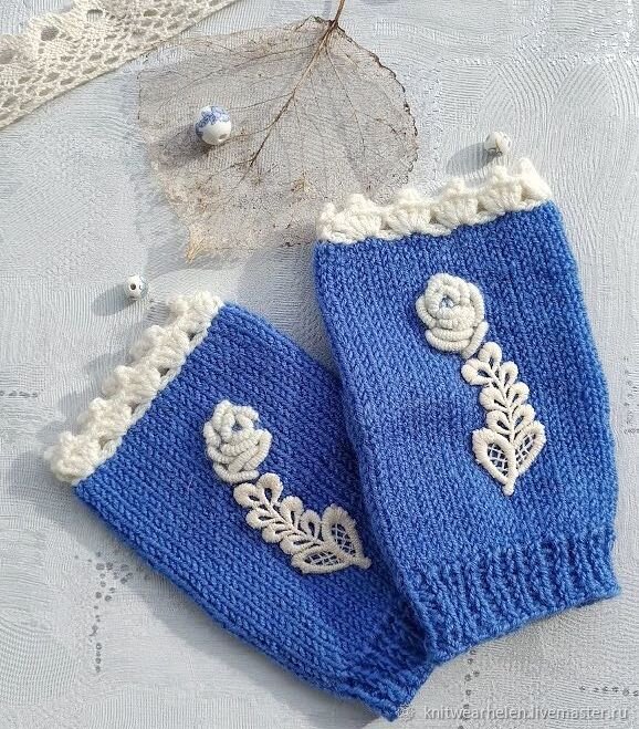 Митенки связаны спицами из полушерстяной пряжи и декорированы кружевным мотивом и вышивкой в технике рококо. По краю обвязаны крючком фестонами из пряжи молочного цвета. Митенки не только согреют ваши ручки в холодную осеннюю погоду, но и поднимут настроение, как любая красивая вещь вашего гардероба. А кроме того, они очень функциональны, не надо снимать их, чтобы позвонить или найти монетку в кошельке) Размер S-M, подойдут на среднюю женскую руку. Длина митенок 15 см. Стоимость 800 руб. + пересылка любым почтовым оператором. Если вас заинтересовала моя работа, пишите в комментариях. Я обязательно отвечу.