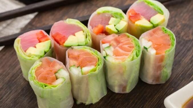 🍣рисовая бумага - 4 шт; 🍣копчённый лосось (форель или сёмга) - 100 гр; 🍣авокадо - 1/2 среднего размера; 🍣огурцы - 1 шт; 🍣помидор - 1 шт; 🍣сливочный сыр - 50 гр; 🍣листья салата - 4 листа; 🍣бальзамический крем - по вкусу и желанию. Процесс: ▫️подготавливаем все ингредиенты - нарезаем соломкой - огурцы, авокадо, помидор, рыбу. Листья салата измельчать не надо, их просто добавляем по 1 листу; 🍣в большую миску наливаем тёплую воду (не горячую), миска должна быть такой, чтобы было удобно промокнуть рисовую бумагу; 🍣 буквально на пару секунд опускаем рисовую бумагу в воду и выкладываем на дощечку - не смущайтесь, что она жесткая, она очень быстро размягчится, а если вы передержите в воде, то она будет непригодна для использования, тк размокнет; ▫️выкладываем на рисовую бумагу лист салата, далее огурцы, авокадо, помидор, рыбу и немного сливочного сыра; ▫️заворачиваем ролл как блинчики или можете просто трубочкой, как вам удобно. Мне было удобно заворачивать как блинчики и потом разр