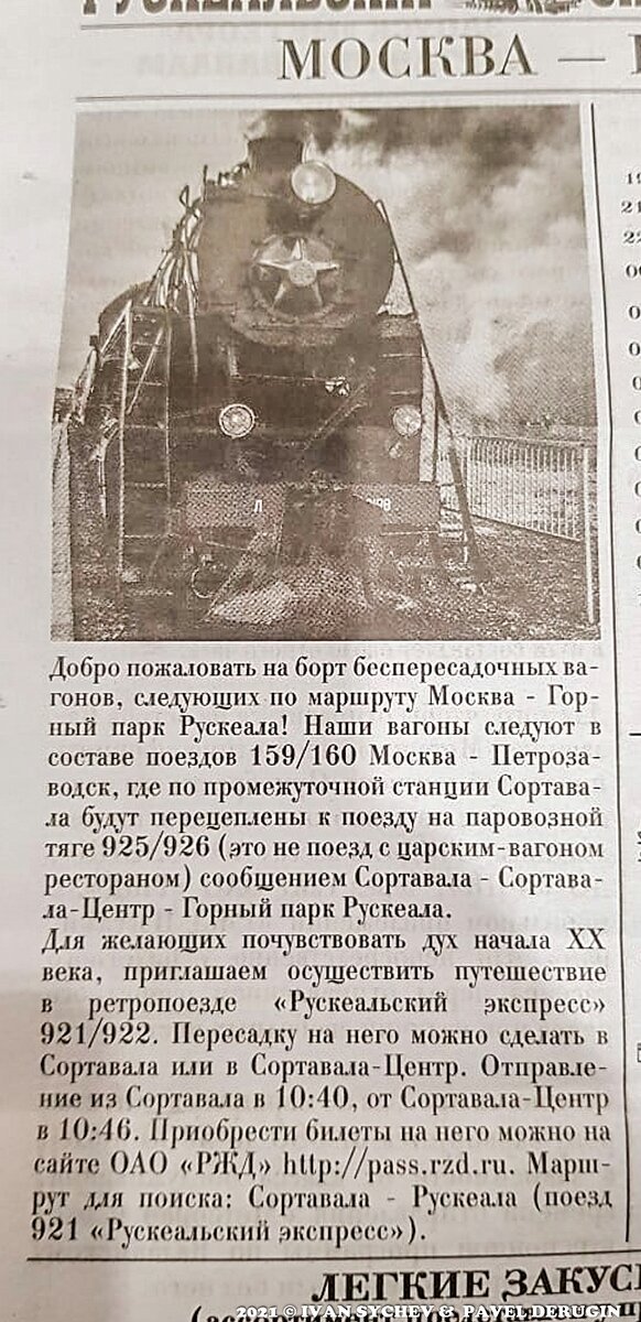 Сегодняшний обзор из фотографий, любезно представленных моим другом, который железной дорогой пользуется как транспортом, исключительно прагматично. Но зная, что я не равнодушен к железнодорожной тематике, он сделал полтора десятка фотографий. Учитывая, что поездка была строго по делу и несколько внезапной, то билет на поезд выбирался не по удобству или по каким-то еще критериям, а исключительно по цене. 1. И вот, оказалось, что именно в это время 30 июля от Москвы да Санкт-Петербурга самый дешевый вариант - в прицепной вагон до Сортавалы в составе поезда №160 сообщением Москва-Петрозаводск. Причем далее, от Сортавалы до парка Рускеала, вагон следует в составе поезда под паровозом. Вот об этом в вагоне и говорит газета-реклама (3 фотографии в карусели) 2. Но давайте ближе к поезду. Вот тот самый вагон, плацкартный, который сегодня будем смотреть внутри. Снаружи выглядит без лоска, но свежеокрашенный, и, что не маловажно, окрашен не в корпоративный цвет, а в синий с желтой полосой - та