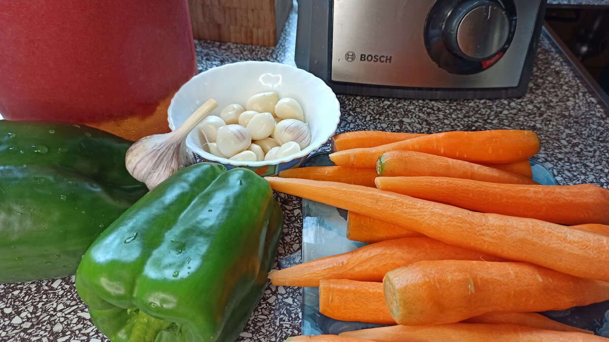 Сижу за компьютером, листаю рецепты. Муж спрашивает: "Что ищешь?" Отвечаю: "Рецепт лечо". "У тебя отличный мамин рецепт, зачем искать что-то новое?" И правда, подумала я, зачем искать то, что уже есть... По маминому рецепту я готовлю лечо давно. По сути в нём нет ничего особенного, но сам процесс приготовления заслуживает внимания. Он хорош тем, что ничего не надо заранее замерять, нужно просто делать. Он какой-то беспрерывный. Пока что-то не закончится. У него есть две вариации: с морковью и без неё, оба вкусные. Сегодня решила приготовить с морковкой. Перцы уже давно наросли, и вот теперь массово пошли помидоры. Я люблю готовить лечо в два этапа, меньше устаю. С вечера приготовила томат. Помыла и перемолола в блендере томаты и откинула их на сито. Можно воспользоваться мясорубкой, мама именно так и делала. Весь расчёт идёт на 3 литра томатного сока. Ставим томат на огонь и доводим его до кипения. Пенку снимаем. В это время шинкуем или натираем на тёрке морковь. Ориентируйтесь на св