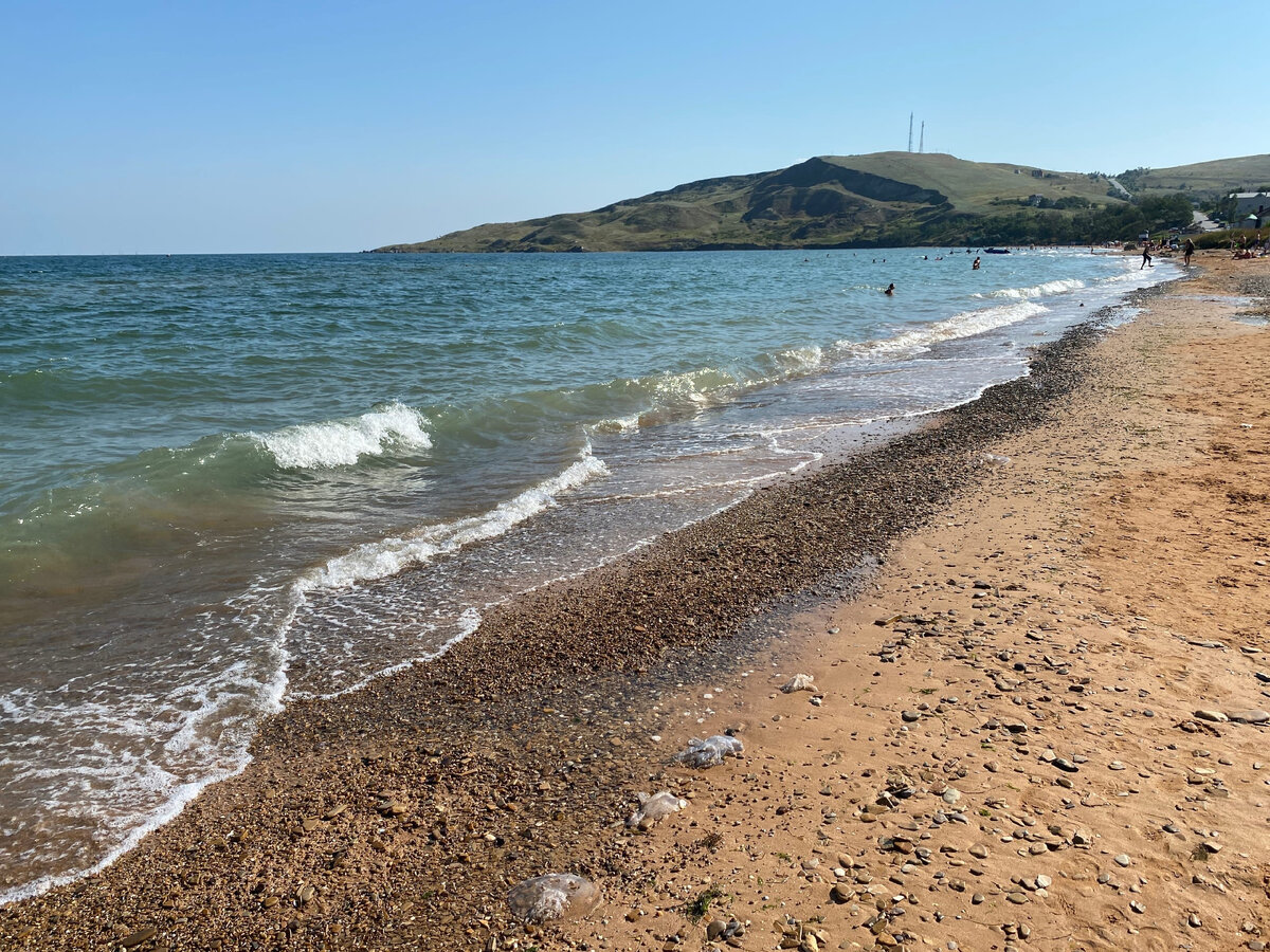 Только вчера писала о том, что море - шикарное, и медуз совсем нет. Сегодня они неожиданно появились! Вот и как после этого не верить в закон подлости? Пришла сегодня утром на пляж, смотрю, а на берегу лежат медузы. В воде они тоже плавают, хотя их и немного. Всё же мне немного дискомфортно, поначалу даже думала не купаться, но потом взяла себя в руки и всё-таки зашла в воду. Сейчас покажу медуз, их можно заметить прямо на берегу. Близко не стала фотографировать, так как зрелище не из приятных. Людей немного, хотя и больше, чем вчера. Видимо, это из-за выходного, многие решили поехать на пляж позагорать. Вот такие красивые пейзажи, мне всё очень нравится, люблю природу. Море немного штормило, хотя ветра почти не было. Потом, когда я уже начала уходить с пляжа, оно успокоилось. Вот такие тут камушки, песочке, в целом пляж хороший. Для тех, кто любит малолюдные места - самое то. Вчера я успела побывать в Героевке, туда ездила уже вечером, чтобы оценить другой пляж. Там тоже неплохо, а