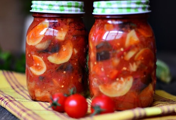 Этот салат из кабачков и баклажанов на зиму – полностью изобретение советской кулинарии. Возможно, вы не помните советские овощные магазины, но это было настоящее испытание для хозяек: во-первых, очереди, во-вторых – ограниченный ассортимент товара даже в самый пик овощного сезона, а в-третьих – отсутствие выбора: если кабачки или синие (баклажаны) лежали в ящиках наполовину сгнившие – приходилось покупать, какие есть, иначе даже таких не достанется. Поэтому изобретательности советских хозяек можно было позавидовать: из скудного набора продуктов они придумывали роскошные рецепты. Один из таких – сегодняшний салат из кабачков и баклажанов на зиму. Я уверена, что он появился как пример «еды для бедных» – обрезав некондиционные части принесенных из магазина овощей, что еще можно было придумать из них, если не салат-ассорти, где всего понемногу? Но сегодня, когда есть возможность купить для заготовок самые лучшие полезные и красивые овощи, я понимаю, что этот салат на зиму – настоящая роск