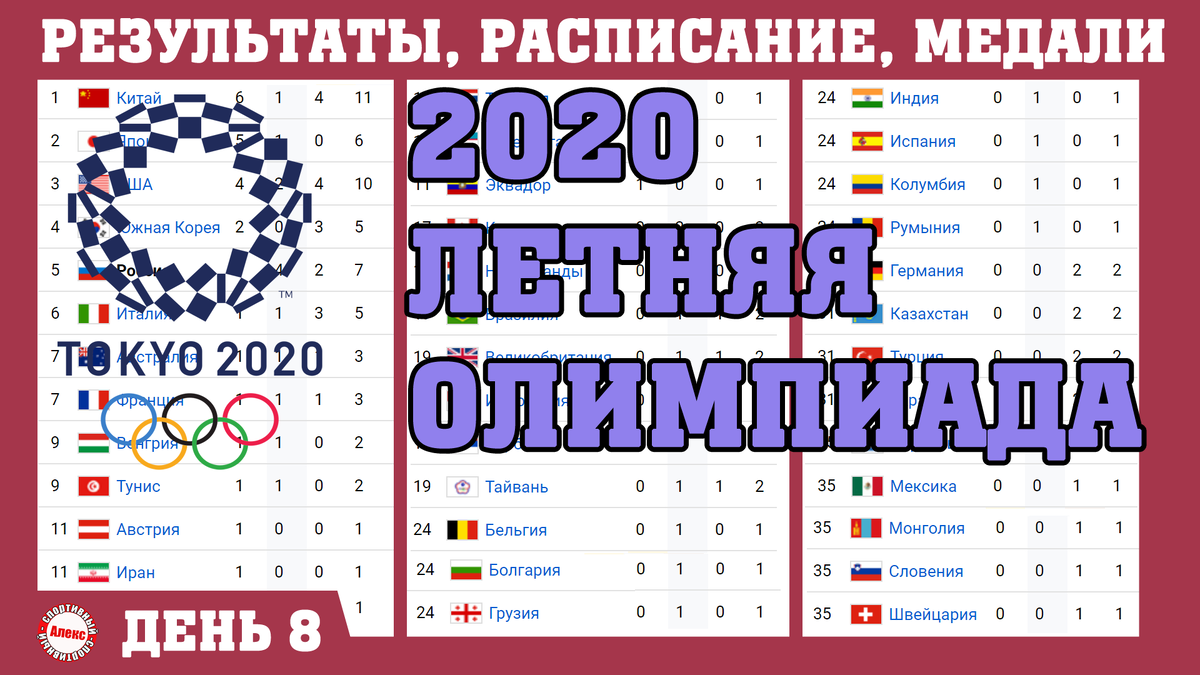 Олимпиада 2020. 1-я медаль булорусов, у России - +3. Итоги 8 дня. Расписание. Медальный зачет.