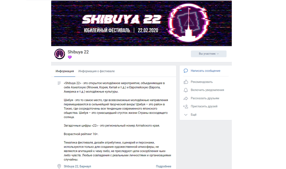 Shibuya 22 - ежегодный косплей-фестиваль, собирающий в Барнауле более тысячи фанатов аниме и манга, назван по имени района в японской столице, где базируется молодёжная субкультурная жизнь. Ещё один косплей-фестиваль – S.O.S. – кочует по сибирским городам Барнаулу, Новосибирску и Томску, в Барнауле он был в 2015 году.