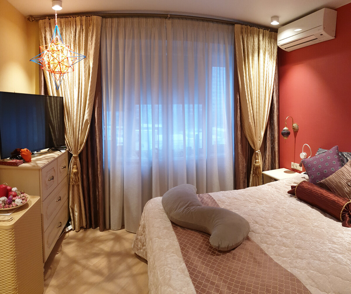 Плотную или легкую ткань выбирать для двойных штор? Зависит от того, на какую сторону выходят окна квартиры и общая цветовая гамма. Если комната маленькая, теневая или темная лучше повесить легкие шторы из тюлевой ткани. Если комната просторная, светлая, солнечная, то смело вешайте плотные шторы.