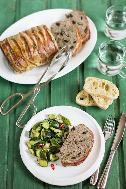 Мясной «хлеб» (или meatloaf) с грибами в красивой корочке из бекона, а еще, легкий и немного острый салат из битых огурцов - чем не идеальная компания для начала недели? В этой «буханке» все как я люблю: готовится несложно - надо подготовить и смешать ингредиенты, а затем просто отправить в духовку. С салатом та же история: трудозатратность минимальная)) И даже если вы отважитесь на приготовление чиабатты (она почему-то всех пугает!), которую я здесь постоянно рекламирую, тоже не потратите много времени и сил. В общем, если вы любите готовить, и сейчас в поиске классных рецептов - это один из них. Пользуйтесь на здоровье! Для мясного хлеба (meatloaf) понадобятся: 450 г фарша из свиной вырезки 450 г говяжьего фарша 400 г шампиньонов 12 полосок сыро-копченого бекона (200-250г) 1 крупная луковица 40 г панировочных сухарей 1 крупное яйцо 50 мл молока 5 веточек тимьяна 2 зубчика чеснока оливковое масло соль свежемолотый перец 60 мл сливок 22% жирности Лук и шампиньоны мелко нарезать. Чесно