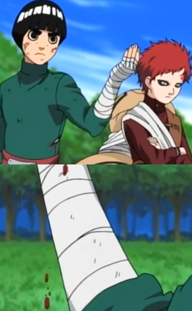 На этот же раз Гаара чрезмерно деликатный: Ли всё таки рвётся в бой, но Гаара хватает его уже за ПРАВУЮ ногу(что бы ничего не повредить на едва вылеченной) песком, а так же услужливо подставляет песчаную подушечку под лицо, дабы Ли не разбил нос и лоб.