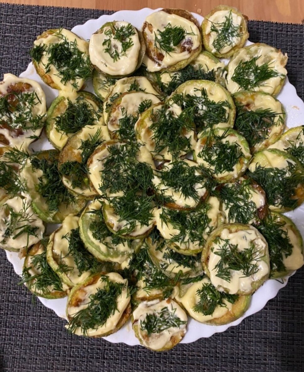 Выкладываем кабачки на блюдо, сверху мажем майонезом с чесноком и посыпаем зеленью. Майонезом мажем на тёплые кабачки, иначе на горячих он свернётся.