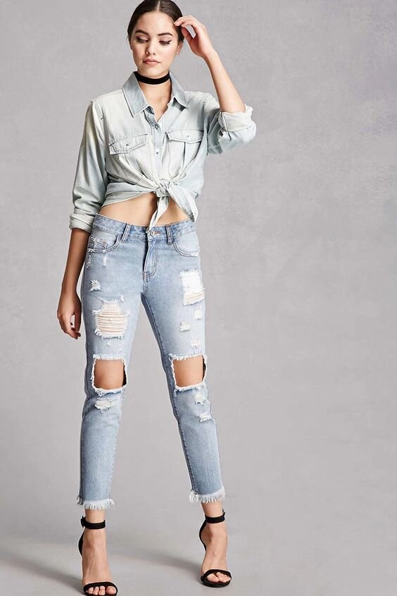 Рваные джинсы – это один из самых главных трендов лета. Их с легкостью можно комбинировать с самыми разными предметами гардероба и получать в итоге стильные и оригинальные образы. Простая майка или футболка – самый простой вариант сочетания с рваными джинсами. Но тем не менее выглядят подобные комплекты действительно модно и при этом лаконично. Что касается обуви, то выбирать можно кеды белого цвета, босоножки, туфли и все, что будет хорошо сочетаться и подчеркивать образ в целом. Прекрасно подходят к этому фасону джинсов футболки оверсайз. Такое сочетание позволяет создать простой, расслабленный образ, который идеально подходит для прогулок по городу, шопинга или же путешествия. Еще не теряют актуальности кроп-топы. Комбинировать их можно абсолютно со всем, начиная от шорт и юбок и заканчивая рваными джинсами. Выглядят такие комплекты действительно интересно и современно. Изящный и женственный наряд запросто можно создать даже с рваными джинсами . Для этого выбирайте футболки и блу