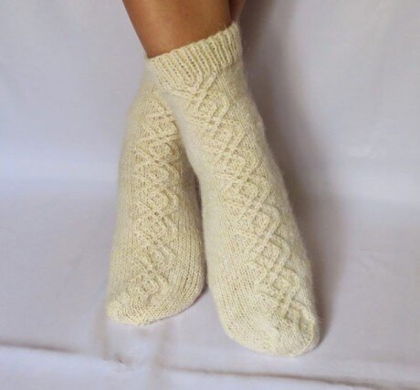 Для работы потребуется 70 – 100 грамм полушерстяной пряжи (300 м/100 г), 25 грамм кид-мохера (250 м/25 г), набор из 5 чулочных обоюдоострых спиц №2,5. Наберите на 2 спицы 48 петель. Распределите петли на 4 спицы по 12 петель на каждую, соедините в кольцо. Свяжите 10 рядов резинкой 1 на 1. В резинке чередуются лицевая и изнаночная петля. Далее на 3 спицах вяжите лицевой гладью (все петли лицевыми за переднюю стенку), на одной спице вяжите фантазийный узор по схеме. Раппорт узора 12 петель. Расположите узор так, чтобы он находился спереди по центру носка. Вяжите так 12 см. Схема узора для вязания носков спицами интересная подборка на knitka.ruВяжем носки спицами30 моделей разной степени сложности 6. Переходите к формированию пятки. Для этого распределите все петли на 2 спицы. Одна половина петель (24 петли) будет приходится на пятку, вторая с узором в центре пока остается без внимания. Вяжите 24 петли пятки на 2 спицах поворотными рядами лицевой гладью на высоту 16 рядов. 7.