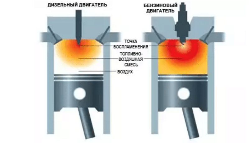 Бензиновые и дизельные двигателя два более часто используемых двигателя внутреннего сгорания. Не смотря на то что их работы схожи, эти двигатели имеют ряд интересных отличий, и у каждого есть свои преимущества. Оба двигателя работают в четыре такта: 1-впуск., 2-сжатие., 3-рабочий ход., 4-выхлоп. Отличия двигателей кроются в способе воспламенения топлива. Бензин легко испаряется, поэтому легко смешивается с воздухом. В результате достаточно искры чтобы произошло воспаление предварительно смешанного топлива в бензиновым двигателе. С другой стороны дизельное топливо не очень хорошо смешивается с воздухом. Однако если дизельное топливо распылить в воздухе с высокой температурой, произойдёт самовоспламенение. Это означает что в бензиновых двигателях топливо и воздух должен быть предварительно смешешаны, а в дизельных двигателях смешивания топлива происходит только во время воспламенения и сгорания. Вот почему в дизельных двигателях используется топливный инжектор, а в бензиновых свеча зажи