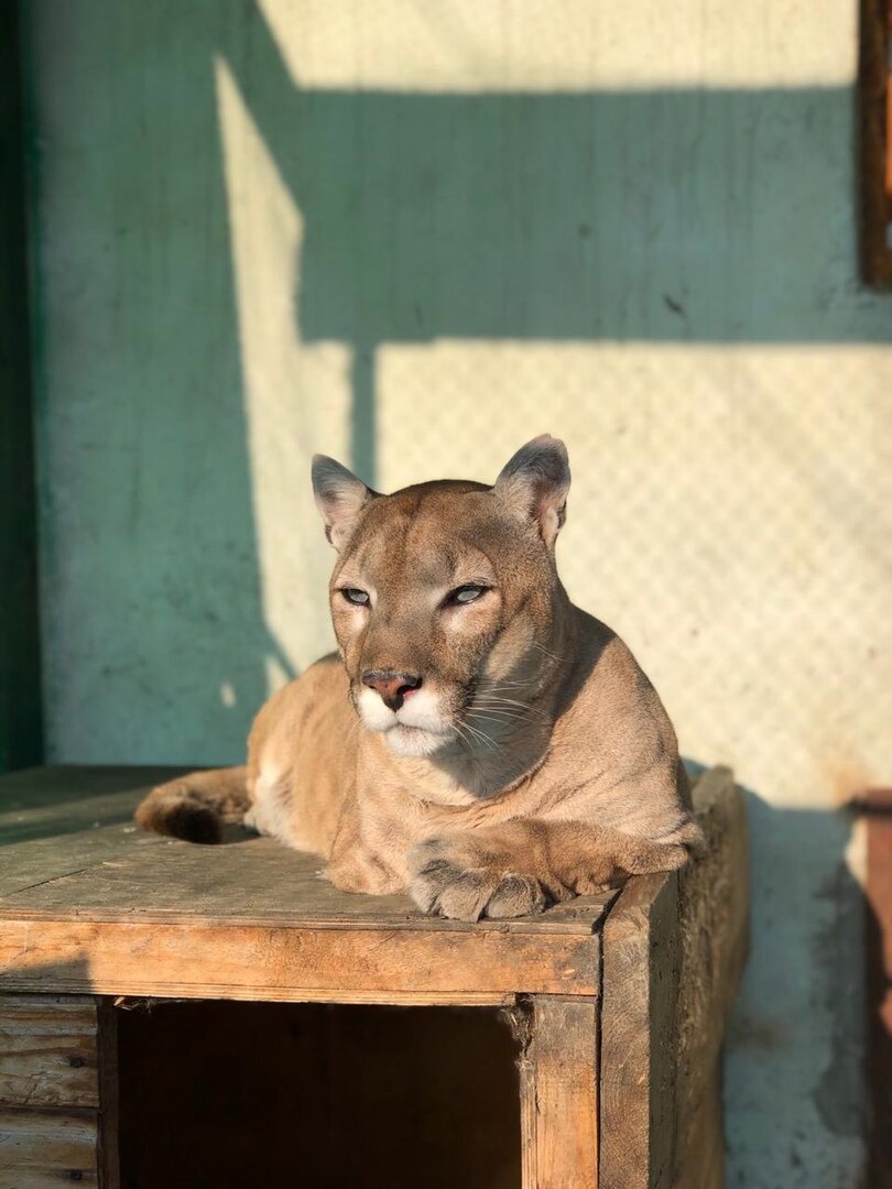 Что касается характера нашего горного льва, то и здесь матушка Природа постаралась. Атосик, не смотря на свои габариты очень нежный и ласковый парень, но как и любой кот, он проявляет эти качества только тогда, когда ему становится скучно или грустно и очень хочется получить свою порцию любви и ласки. В такие моменты он подходит к сетке и жутким голосом, похожим на кряканье огромной утки))), начинает звать хоть кого-нибудь))) Подходишь к нему, подставляешь руку и это голубоглазое чудо начинает тереться об неё, пускает слюни и громко, как трактор начинает мурлыкать, в такие моменты мне очень хочется его обнять, расцеловать, НО, конечно же есть НО, большое и толстое)))), хоть Тосечка и мурлычит, как домашний котяра, но не стоит забывать, что он всё таки лев, хоть и горный, хоть и меньше своих африканских собратьев, но всё же лев, хищник и как не крути, с этим приходится считаться. Тося хоть и прищуривает глазёшки, когда ластится, но продолжает следить за твоими действиями и если вдруг его начинаешь чесать там, где ему не очень нравится, он резко поворачивает голову и может тебя цапануть)) Я ни разу не попадала ему в пасть)))), а вот некоторым не повезло, хоть и не сильно, но Тосик покусал практически всех наших, кроме папы Карена, который хорошо знает повадки хищников и не делает так, чтобы заслужить неприятный комплимент от сыночка)))), а я просто трусиха и стараюсь быть с ним осторожной, как в прочем и с другими нашими любимками.
