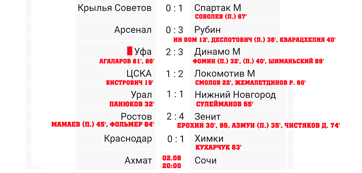 Здравствуйте, уважаемые любители футбола. В российской премьер – лиге состоялись матчи 2 тура. Результаты, таблица, расписание. Крылья Советов – Спартак (0:1). Арсенал – Рубин (0:3) Уфа – Динамо (2:3). ЦСКА – Локомотив (1:2). Урал Нижний Новгород (1:1) Ростов – Зенит (2:4). Краснодар – Химки (0:1). 2 августа должен состояться матч между Ахматом и Сочи. Расписание следующего тура. Список лучших бомбардиров и ассистентов Жемалетдинов из Локомотива и Ерохин из Зенита забили по 3 мяча. Турнирная таблица. Зенит, Рубин, Локомотив, Динамо одержали по две стартовые победы. 4 очка у Нижнего Новгорода. Давайте, проголосуем: выйдет ли Нижний Новгород в еврокубки?