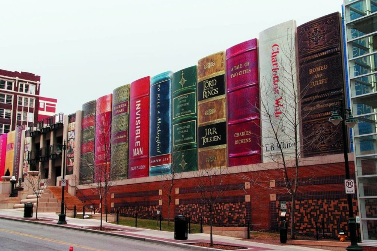 Библиотека которая похожа на полку с огромными книгами в Канзас Сити