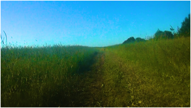 Вытоптанная лесная тропка пролегает сквозь лес. Для всего, что ездит; велосипеды, скутеры, квадрики. Далее, после катания через лес, часть поля прорезает дорога, вид которой вовсе не похож на красивое фото. Гусеницы и танки... Шарахается животинка, притаившаяся в высокой траве.