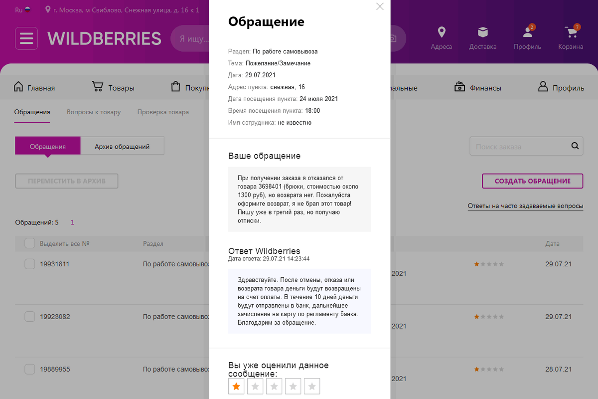 Два дня я пытался добиться от поддержки Wildberries решения простого вопроса, но оказалось, что сделать это непросто. C началом пандемии Wildberries убрали терминалы оплаты из пунктов самовывоза и начали требовать полную предоплату за все заказанные вещи, а если что-то из одежды и обуви не подходило по размеру, делали возврат. Сейчас некоторым покупателям разрешили онлайн-оплату при получении товара. Мне не разрешили. Я заказал две пары брюк и оплатил их. В пункте выдачи померил их и решил взять одни, от вторых отказался, но возврат не появился в приложении ни в тот же день, ни на следующий, ни через пять дней. У Wildberries нет чата поддержки, по телефону им звонить почти бесполезно, остаётся только письменное обращение в поддержку, но на полученный ответ нельзя ответить - нужно создавать новое обращение, которое прочитает другой оператор. Этим они отлично пользуются, генерируя отписки. Написал в поддержку: "Я отказался от покупки товара 3698401, но возврата не вижу".