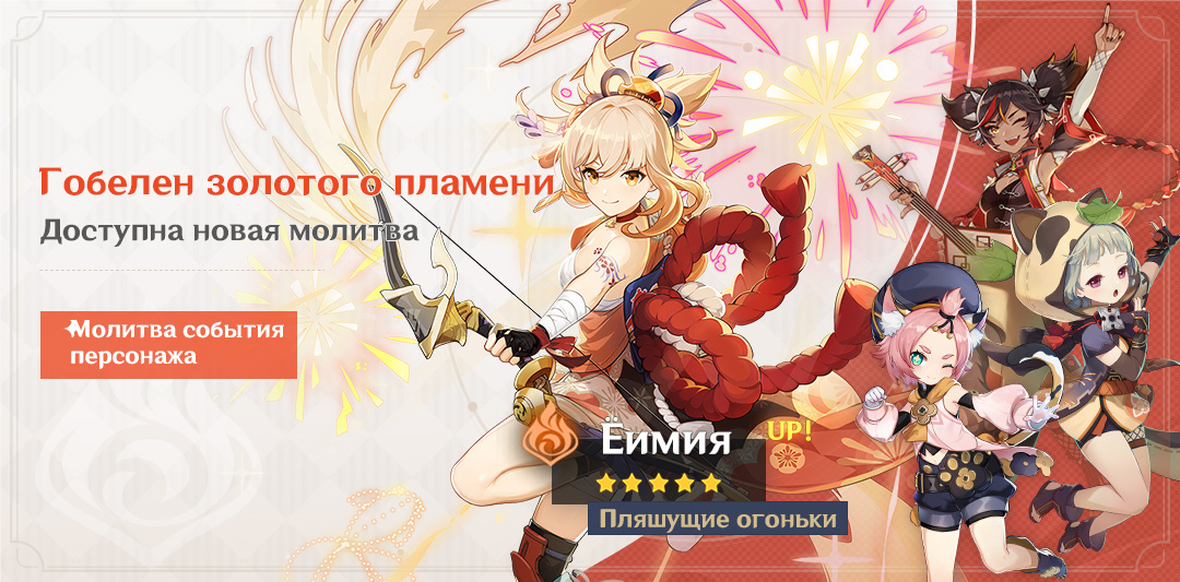 Студия miHoYo поделилась информацией о том, что ждет игроков Action/RPG Genshin Impact во второй половине обновления 2.0. Впереди еще много увлекательных событий, а также баннеры, которые представят новых персонажей Еимию и Саю, а также предоставят возможность получить эксклюзивное оружие. Баннер персонажей “Гобелен золотого пламени” С 10 по 31 августа будет активна молитва, которая существенно увеличит шансы получения пятизвездочного персонажа Еимия (Пиро), а также четырехзвездочных Саю (Анемо), Диона (Крио) и Синь Янь (Пиро). Также в этот период игроки смогут испытать этих персонажей в тестовом забеге и получить различные награды. Баннер оружия “Воплощение божества” Вторую оружейную молитву запустят с 10 по 31 августа. Во время нее будут увеличены шансы получения эксклюзивного пятизвездочного оружия Громовой пульс (Стрелковое) и Небесный меч (Одноручное). Кроме того, в состав баннера также войдет четырехзвездочное оружие Церемониальный меч (Одноручное), Дождерез (Двуручное), Гроза др