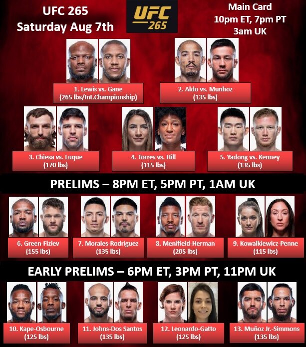 На арене Toyota Center в Хьюстоне (штат Техас, США) прошёл турнир по смешанным боевым искусствам UFC 265. В главном бою бойцовского вечера определился временный чемпион UFC в тяжёлом весе. Предлагаем вам ознакомиться с результатами всех поединков турнира. UFC 265 результаты всех боёв вечера Основной кард Предварительный кард Ранний предварительный кард Если Вам понравилось и было интересно, ставьте лайк. Это позволит увидеть эту новость как можно большему количеству поклонников спортивных единоборств и боевых искусств.