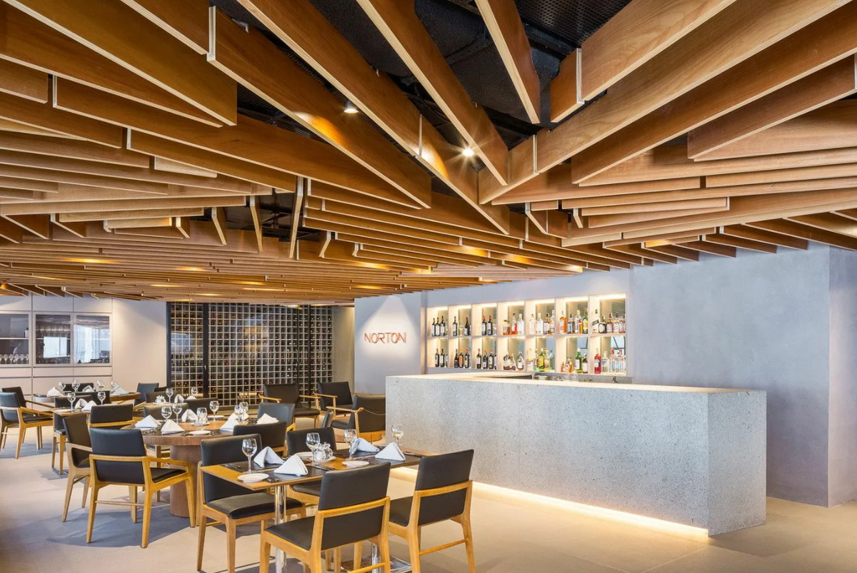 При оформлении потолка в таком заведении как ресторан, можно рассмотреть несколько варрантов; - наилучшим оформлением потолка считаются ячейки «штрекметалл-дизайн» наделенные сетчатой перфорацией. Эти кассеты имеют отверстия, которые пропускают воздух и при этом незаметны для глаз, а визуально виден лишь ненавязчивый узор. Монтаж потолка «штрекметалл-дизайн» прост и оперативен, а места стыков незаметны, даже через несколько лет эксплуатации, - произведенные из анодированного алюминия, потолки с зеркальной структурой, выделяются своей высокой прочностью, в том числе качеством, стойкостью к коррозии и при этом могут прослужить довольно долго. Данный вид потолка подойдет даже для самых жестких условий, что немаловажно для ресторанов. Следует отметить, что на вечеринках в таких заведениях, может случиться всякое, скажем, пробка от шампанского, которая попадает в потолок, обязательно оставит отметину. По этой причине, ластиковый потолок придется менять полностью, если потолок из гипсокартон