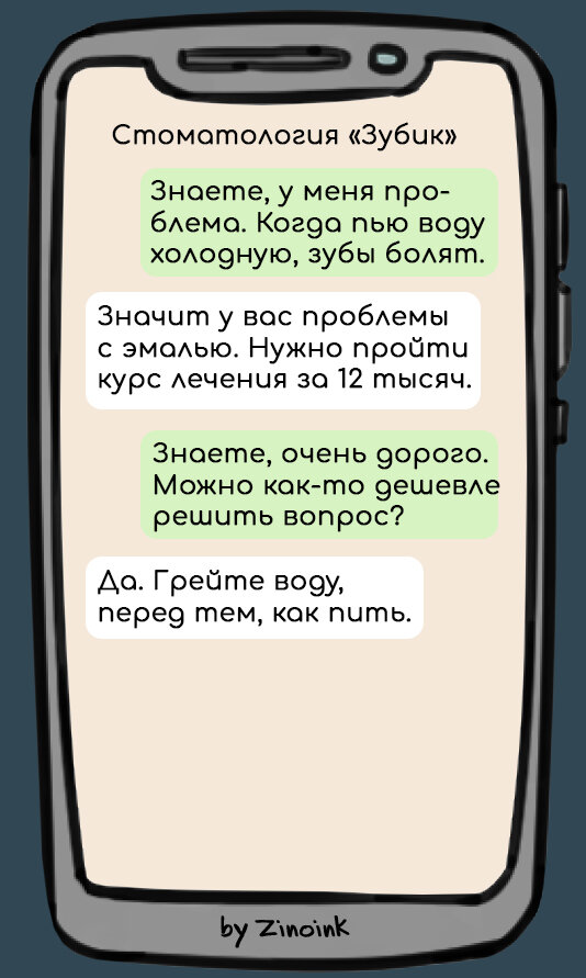 Надеюсь, ты не испытываешь сильного страха перед этой категорией врачей, потому что здоровье зубов легче всего (и дешевле!) поддерживать, если ты посещаешь стоматологическую клинику регулярно. Но даже если легкий мандраж присутствует, возможно, сегодняшние #сообщения помогут тебе с юмором отнестись к своему страху.