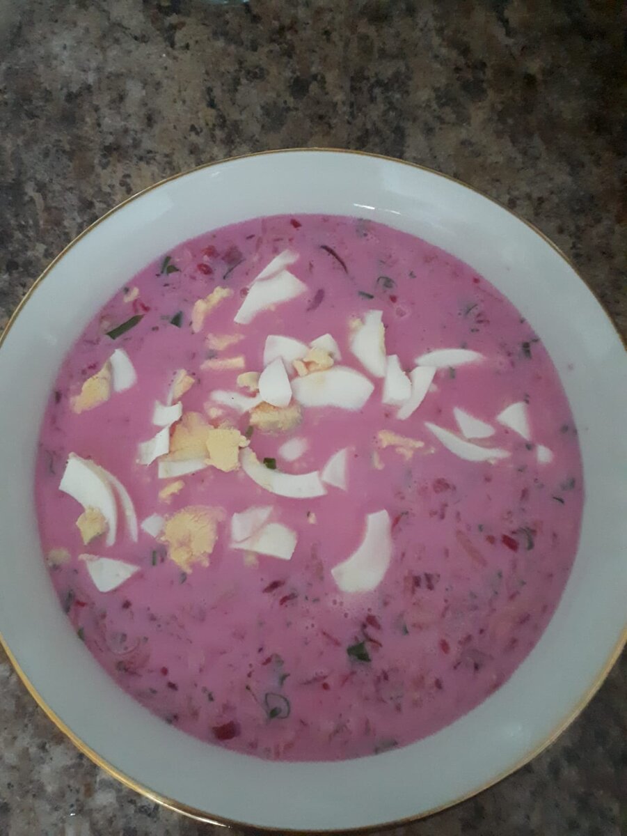 Это - замечательная альтернатива нашей окрошке. 1. Сварить свеклу,остудить и натереть на крупной тёрке. 2. Свежие огурцы очистить от шкурки и также натереть на крупной тёрке. Смешать+соль,зелёный лук,укроп и заправить сметаной. 3. Разбавить холодным кефиром. Дать настояться в холодильнике 30 минут. Подавать с варёным яйцом.