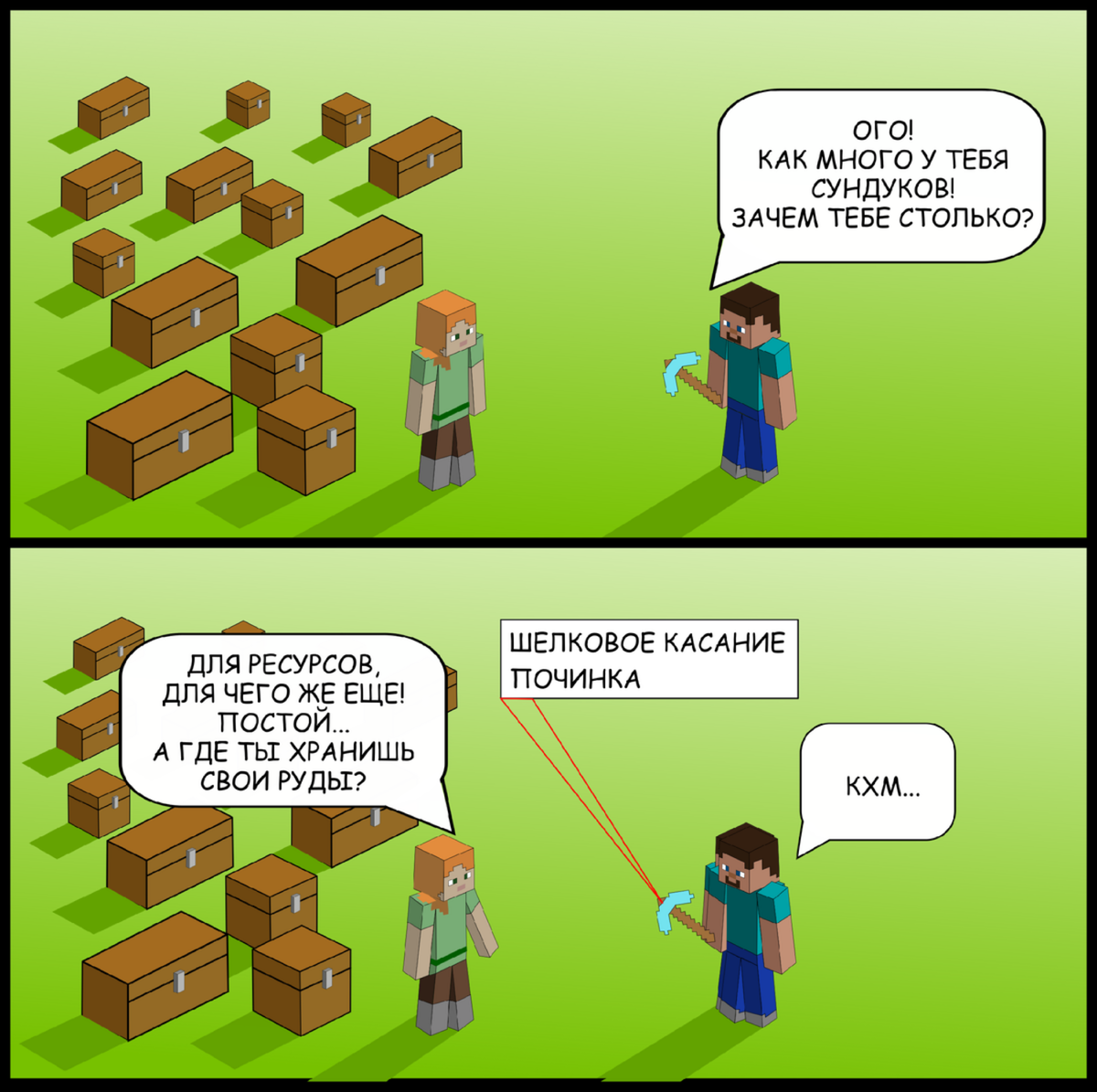 Иногда игроки в Minecraft творят такое, что не объяснишь, если не знаешь, как все начиналось. В этих комиксах я пытаюсь угадать, что же происходило до событий в видео. Сложности хранения А вот где: Плыви по воздуху, как по воде Стив думал, что может обернуть проклятие Ведьмы в свою пользу... Но это бы не было проклятием, если бы все прошло гладко: На самом деле такой баг может произойти, если портировать сохранение из Java в Bedrock. Не каждый может стать инженером То самое "изобретение" Стива: Знаю, обещал сделать выпуск на прошлой недели, но что-то пошло не так. Не пинайте.