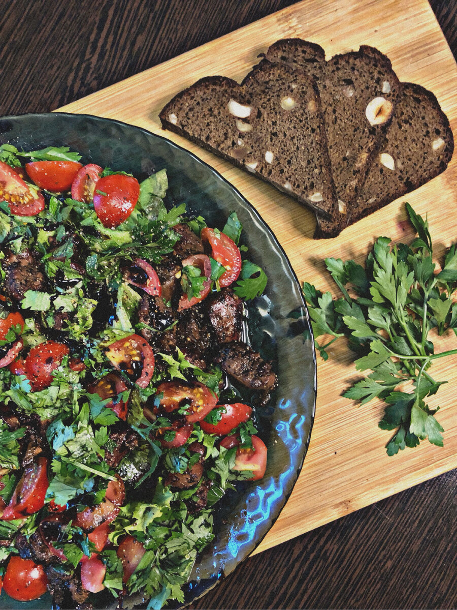 Я очень люблю, когда все просто, вкусно, симпатично, поэтому поделюсь своей версией использования куриной печени. Вообще, печень мы не очень любим, поэтому приходится изощряться. Итак, нам потребуется: куриная печень, помидоры (желательно черри) , зелень ( у меня листья салата, кориандр , петрушка), бальзамической соус и сок лимона- для заправки , лук , мед и растительное масло -для жарки. Теперь можем начинать готовить. 1.Сначала обжариваю лук в растительном масле до золотистой корочки. 2.Вливаю ложечку мёда, обжариваю секунд 30 , добавляю промытую порезанную кусочками печень. 3.Обжариваю печень около 15 минут. 4.Выкладываю на тарелочку, добавляю зелень, рву листья салата , режу помидорки черри. 5.Сверху поливаю бальзамическим соусом и добавляю лимонный сок. Готово! Вы восхитительны! Приятного аппетита!