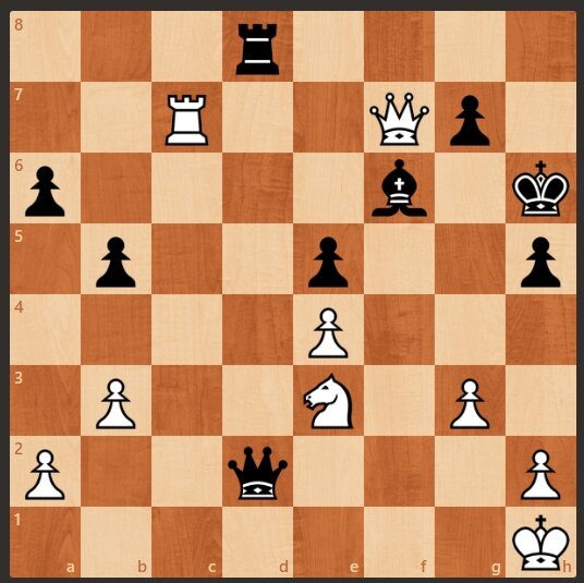 Шахматная задача. Позиция равная в материальном плане. Черные напали ферзем на белого коня. Черные так же могут дать шах белому королю. Белые легко могут сделать ничью дав шах конем на f5. Но белые начинают и ставят мат в три хода. Подписывайтесь, ставьте лайк. Решение идет далее. 1. Белые отдают ферзя на f6. 1. ............................. черные бьют пешкой на f6. 2. Белые дают шах конем на f5. 2. ........................ черные отходят королем на g6. 3. Белые ставят мат ладьей на g7. Следующая задача тут>>>>