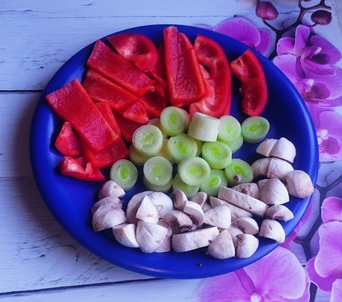 Даже не знаю, к какой категории отнести этот рецепт. "Горячие блюда" или "Закуски". Готовит такую курочку моя Мама. Как говорится "подсел на него". Получается довольно интересное блюдо. Очень нежное и не слишком жирное. Производное от классики: "мясо с луком, помидорами, сыром и майонезом в духовке". В холодном виде даже вкуснее чем в горячем. Вот, что нам будет нужно (многовато, но это не страшно): Бедро куриное — 6 шт. Лук-порей (белая часть) — 2 шт. Перец болгарский — 1 шт. Масло растительное — 1 ст. л. Шампиньоны — 6 шт. Порошок чесночный — по вкусу. Соль — по вкусу. Смесь перцев (из мельницы) — по вкусу. Сметана — 100 гр. Майонез — 100 гр. Вода — 50 мл. Яйцо куриное — 1 шт. Приправа ("Вегета") — 1 ч. л. Помидор — 1 шт. Оливки черные — по вкусу. Зелень — по вкусу. 01. Лук порей режем на колечки толщиной примерно 0,5 см. Перец нарезаем вдоль, на пластины, примерно по размеру куриных кусочков. (Маленький совет. Куски перца получатся выпуклыми. Переворачиваем кусочек перца шкуркой в