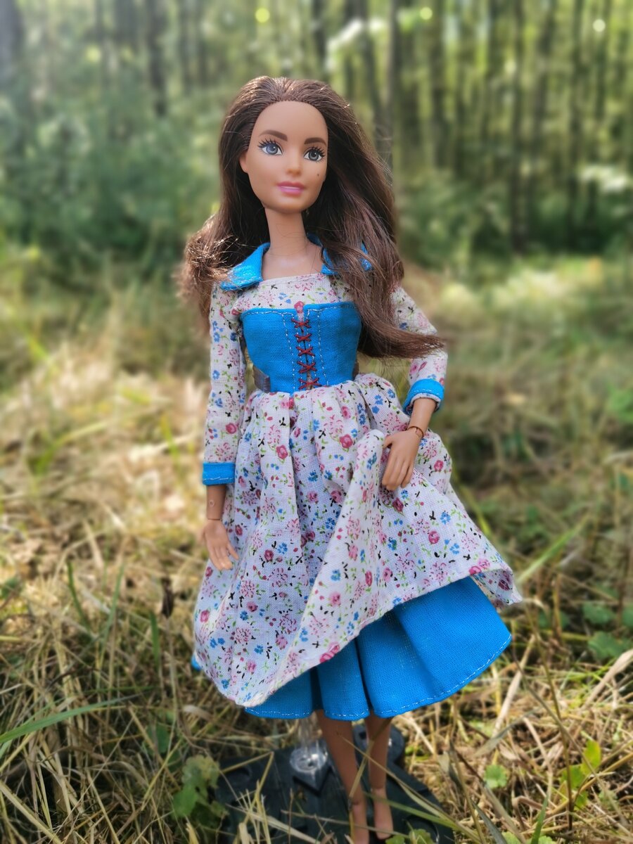 Приветствую вас, дорогие любители и ценители кукол Барби. На своем канале я рассказываю о своей коллекции и о тех вопросах и трудностях, с которыми я сталкиваюсь, как начинающий коллекционер. Но кроме коллекционирования Барби, я очень люблю моделировать и шить для этих замечательных кукол. Поскольку я знаю, что мое увлечение разделяют очень многие, то решила рискнуть и поделиться моими идеями аутфитов для Барби. Сегодняшний наряд я шила для куклы дочери еще в прошлом году. А сегодня решила поделиться с вами тем, как его можно повторить. Но для начала продемонстрирует его во всей красе ваша старая знакомая Барби-йожка по имени Стелла. Поскольку наряд шился на нее, кому как не ей его показывать? Для этого наряда использовалась ткань двух цветов. Основным, базовым цветом стал небесно-голубой. Из бязи этого цвета выполнен и подъюбник, и рукава, и воротник и корсаж платья. Все детали прошиты были по краю серебристой ниткой. Корсаж не съемный. Рукав 3/4. Платье застегивается на спине с помо