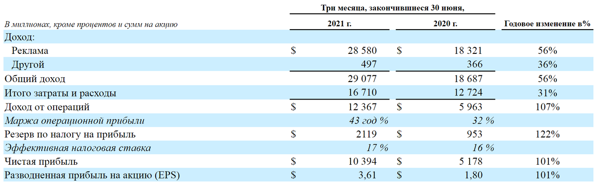 MENLO PARK, Калифорния - 28 июля 2021 года - Facebook, Inc. (Nasdaq: FB) сегодня опубликовал финансовые результаты за квартал, закончившийся 30 июня 2021 года. «У нас был хороший квартал, поскольку мы продолжаем помогать бизнесу расти и людям оставаться на связи», - сказал Марк Цукерберг, основатель и генеральный директор Facebook. «Я рад видеть, как наши основные инициативы, связанные с создателями и сообществом, коммерцией и созданием следующей вычислительной платформы, объединяются, чтобы начать воплощать в жизнь видение метавселенной». Основные финансовые показатели за 2 квартал 2021 года Основные операционные и другие финансовые показатели за 2 квартал 2021 года • Ежедневные активные пользователи Facebook (DAU) - DAU составили в среднем 1,91 миллиарда в июне 2021 года, что на 7% больше, чем в прошлом году. • Ежемесячные активные пользователи Facebook (MAU) - MAU составили 2,90 миллиарда по состоянию на 30 июня 2021 года, что на 7% больше, чем в прошлом году. • Ежедневно активные