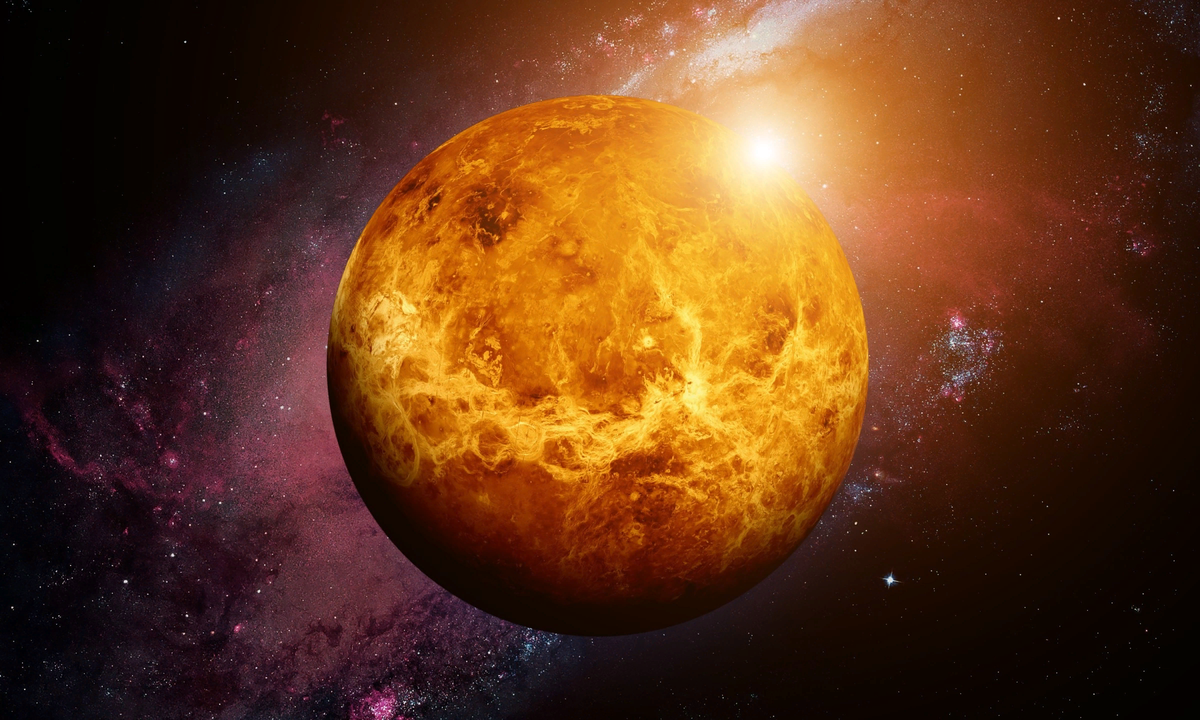 Венера – вторая по расстоянию от Солнца и ближайшая к земле планета Солнечной системы. Среднее расстояние от Солнца 108 млн. км. Для земного наблюдателя угловое расстояние Венеры от Солнца не превышает 48°, вследствие чего она видна только в течение некоторого времени после захода Солнца (вечерняя звезда) или незадолго до его восхода ( утренняя звезда ). Венера – наиболее яркое (после Солнца и Луны ) светило земного неба. Существование атмосферы Венеры установлено впервые М. В. Ломоносовым при наблюдениях прохождения ее по диску Солнца в 1761 г. Дальнейшие сведения о ближайшей соседке Земли накапливались весьма медленно. Виною тому – плотная атмосфера, под сплошным покровом которой наземные наблюдатели не могут видеть в телескопы поверхность Венеры и по сей день. Продолжительность суток на Венере равна примерно 100 часам. А поскольку вращение обратно тому, что имеет Земля, то Солнце на Венере всходит на западе и садится на востоке. Для наблюдателя на поверхности планеты между двумя пос