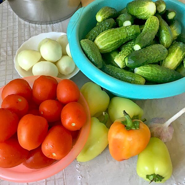 Салат из огурцов и помидоров на зиму не требует стерилизации, поскольку овощи варятся до раскладывания в банки. Процесс варки не долгий, так что огурцы и помидоры остаются почти как свежие, не разваливаются, и благодаря консервантам – уксусу, соли и сахару – долго хранятся. Ингредиенты: