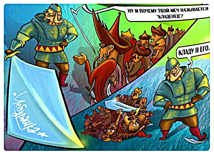 Эти комиксы покажут, что значит силушка богатырская. Художник под псевдонимом "Чебурашка" придумал необычные истории о новых приключениях богатырей. В них русские силачи побеждают своих исторических врагов, захватчиков земли русской, а ещё современных злодеев. Комиксы отлично детально прорисованы, где-то более смешные, местами просто наполнены тонким юмором или шутками. Но всегда невольно вызывают улыбку. (Фото с vk.com). Приятного чтения! Меч кладенец Каламбур основанный на том, как с помощью зачарованного меча можно легко победить врагов на поле боя. В данном случае, богатырь победил татаров - захватчиков. Терминатор Будь ты хоть киборг, хоть боевая машина, против силы духа не попрёшь. Кулачный бой На Руси даже забава такая была - драться на кулаках. Так что уж постоять за себя точно умели. Когти в дело Илья Муромец уверен, что злодеев можно перевоспитать, а их грозное оружие использовать в мирных целях. Не совсем понятно, как в компанию плохишей затесался Росомаха. Наверное, просто