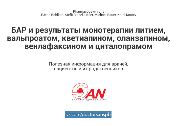 Ретроспективное исследование включало пациентов с биполярным расстройством, которые первоначально начали монотерапию литием, вальпроатом, кветиапином, оланзапином, венлафаксином или циталопрамом. Было обследовано 4990 пациентов с биполярным расстройством. Первоначально применялась монотерапия литием (n = 1,098), вальпроатом (n = 502), кветиапином (n = 927), оланзапином (n = 927), венлафаксином (n = 574) или циталопрамом (n = 962). В течение 24 месяцев неэффективность лечения отмечена у 76,3% (литий), 85,1% (вальпроат), 84,6% (кветиапин), 85,2% (венлафаксин), 92,1% (оланзапин) и 86,6% (циталопрам) пациентов, соответственно. Отношение рисков неэффективности лечения по сравнению с литием в качестве эталона было самым высоким для оланзапина, за ним следовали циталопрам, кветиапин, вальпроат и венлафаксин. Подробнее о БАР: https://doctorsan.ru/lechenie-bipolyarnogo-rasstroystva Источник: https://www.thieme-connect.de/products/ejournals/abstract/10.1055/a-1348-1523?device=mobile&innerWidth=9