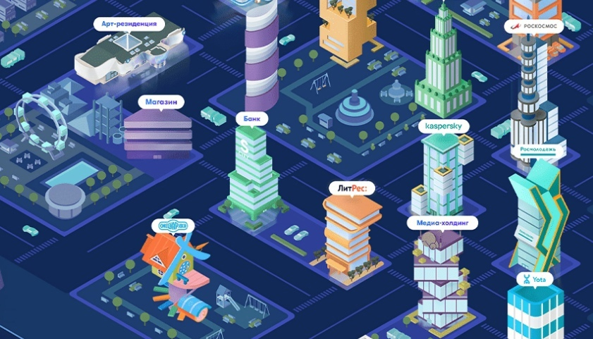 Объясним, как это работает: в виртуальном городе есть две локации — в одной ты работаешь, узнаешь информацию о крупных компаниях и о профессиях, представленных там, а в другой, в студенческом городке — ты обучаешься
