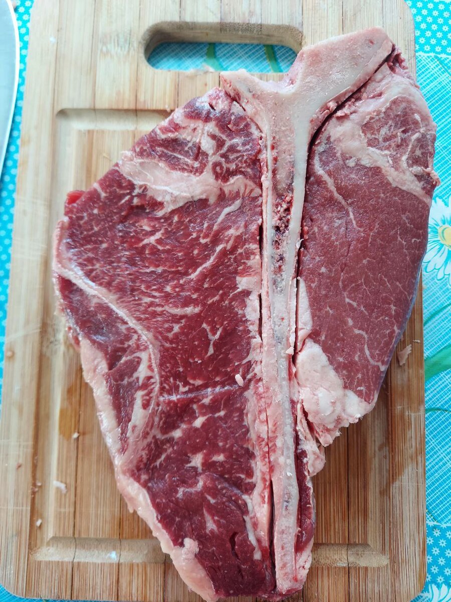 И вот выходные, а это значит, что пришла пора доставать свой старый-добрый гриль. В прошлый раз я писал, что мною от компании стейк&хоум был получен чудесный стейк портерхаус. Чудесен он прежде всего тем, что является 2 в 1. Одна часть (та что побольше) - это мясо из тонкого края туши бычка, а вторая (та что поменьше) это вырезка из которой делают филе миньон. Посередине их разделяет Т-образная кость. Ну что... угли в стартере набирают жар, стейк вынут из вакуумной упаковки, просушен бумажными полотенцами и лежит прогревается до комнатной температуры. Так как мясо у меня зернового откорма с мраморностью prime, то соответственно и требует чтобы его только посолили и поперчили, и больше ничего, мы же хотим насладиться вкусом прекрасного стейка. Солю и перчу я стейки за 15 минут до начала готовки. Ну вот и пришло время!!! Угли выложены в гриле конфигурацией 50/50 для прямого и непрямого жара. Решетка очищена. 3-2-1 стартуем!!! Прежде всего на стейке необходимо добиться хорошей корочки.