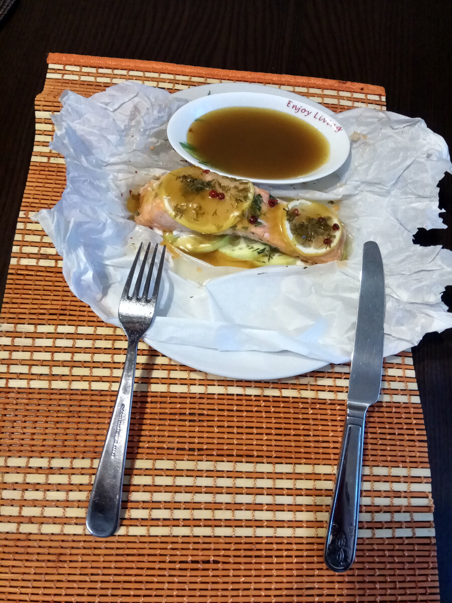 Филе форели, запеченное в пергаменте на подушке из кабачка с медово - горчичным соусом.