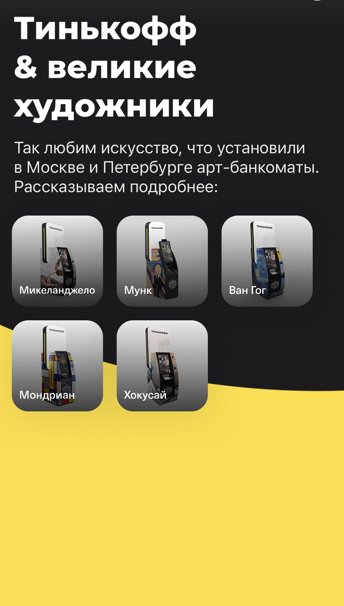 Так, Тинькофф брендирует свои банкоматы картинами великих художников различных эпох. "Арт-банкоматы" украсили Москву и Петербург, выделяясь на фоне других машин в фирменных цветах банков, тем самым прорываясь через визуальный шум, привлекая к себе внимание и вызывая уважение к бренду, который сделал из своего оборудования картинную галерею.