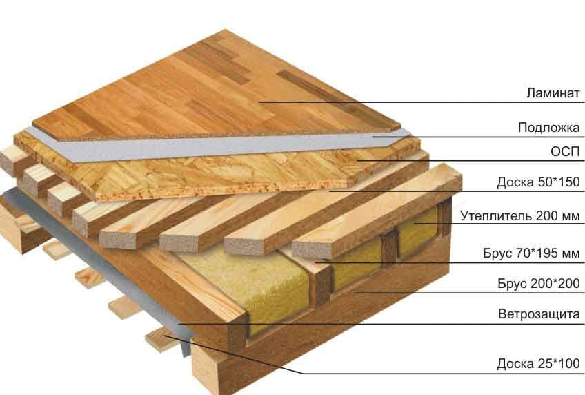 Чтобы соответствовать всем этим требованиям, перекрытия в каркасных домах сооружаются по одному и тому же принципу. В роли несущей части выступают лаги или балки из 150-й доски. Между ними укладывается теплоизоляционный материал, который закрывается со стороны жилых комнат пароизоляцией. Если конструкция одной стороной ориентирована к неотапливаемому чердаку, грунту или пространству между сваями, то она защищается от продувания и наружной влаги.