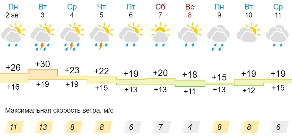 Синоптики рассказали, какая погода ожидает жителей Кировской области на неделе со 2 по 8 августа. Предстоящие семь дней в Кировской области ожидаются дождливыми. По прогнозу синоптиков, дождь будет идти каждый день, при этом во вторник, среду и четверг также ожидаются и грозы. Вместе с грозой во вторник вероятно усиление ветра с порывами до 13 м/с. В остальные дни недели скорость ветра не превысит 4-11 м/с. Что касается температурного режима, то наиболее жаркой ожидается первая половина недели. С понедельника по среду синоптики прогнозируют: днем – от +23°C до +30°C, по ночам – от +15°C до +19°C. Начиная с четверга, в области немного похолодает: столбики термометров в дневное время не будут подниматься выше отметки в +22°C, в ночное – не преодолеют рубеж в +15°C.