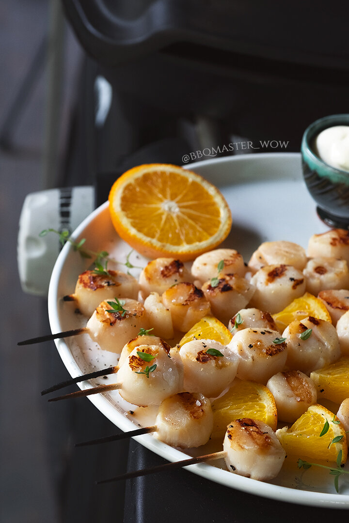 Всем гурманам посвящается... ИНГРЕДИЕНТЫ: ▪️600 г морского гребешка ▪️1 апельсин ▪️сливочное масло ▪️1 ст.л. свежих листиков тимьяна ▪️майонез ▪️соль и черный молотый перец по вкусу⠀ А также: ▪️деревянные шпажки (замочить в воде на 30 минут). ⠀ ПРИГОТОВЛЕНИЕ: 🍴 Разморозить гребешки в холодильнике. 🍴 Промокнуть бумажным полотенцем. 🍴 Растопить сливочное масло. 🍴 Порезать апельсин треугольниками. 🍴 Поочередно нанизать на шпажки гребешки с апельсином, а затем с помощью кисти смазать растопленным сливочным маслом. 🍴 Подготовить гриль для работы в режиме прямого сильного жара 230-250°С. 🍴Выложить шпажки в зону прямого жара и обжарить по 1-1.5 минуты с каждой стороны под закрытой крышкой. 🍴Готовые гребешки слегка посолить, поперчить и посыпать свежими листиками тимьяна. Подать с майонезом. Мне нравится отправить в рот гребешок и закусить жаренным апельсином в майонезе 😎 Бомбическое сочетание! ⠀ Любите гребешки? Как готовите?