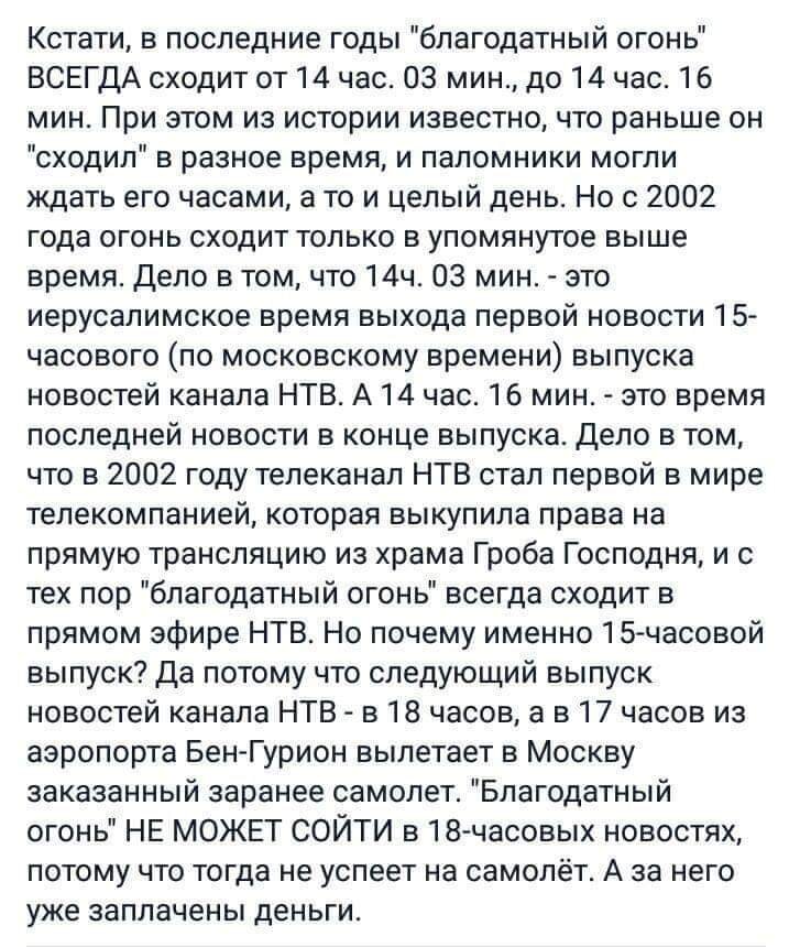 "Вот цитата из "Книги моего бытия" епископа Порфирия (Успенского), которая является не воспоминаниями, а дневником: "В тот год, когда знаменитый господин Сирии и Палестины Ибрагим, паша египетский, находился в Иерусалиме, оказалось, что огонь, получаемый с Гроба Господня в великую субботу, есть огонь не благодатный, а зажигаемый, как зажигается огонь всякий. Этому паше вздумалось удостовериться, действительно ли внезапно и чудесно является огонь на крышке Гроба Христова или зажигается серною спичкою. Что же он сделал? Объявил наместникам патриарха, что ему угодно сидеть в самой Кувуклии во время получения огня и зорко смотреть, как он является, и присовокупил, что в случае правды будут даны им 5000 пунгов (2500000 пиастров), а в случае лжи пусть они отдадут ему все деньги, собранные с обманываемых поклонников, и что он напечатает во всех газетах Европы о мерзком подлоге. Наместники Петроаравийский Мисаил, Назаретский митрополит Даниил и филадельфийский епископ Дионисий (ныне Вифлеемски